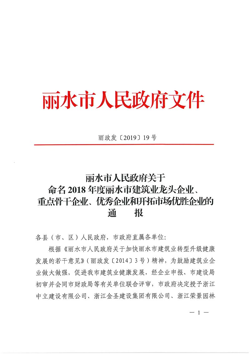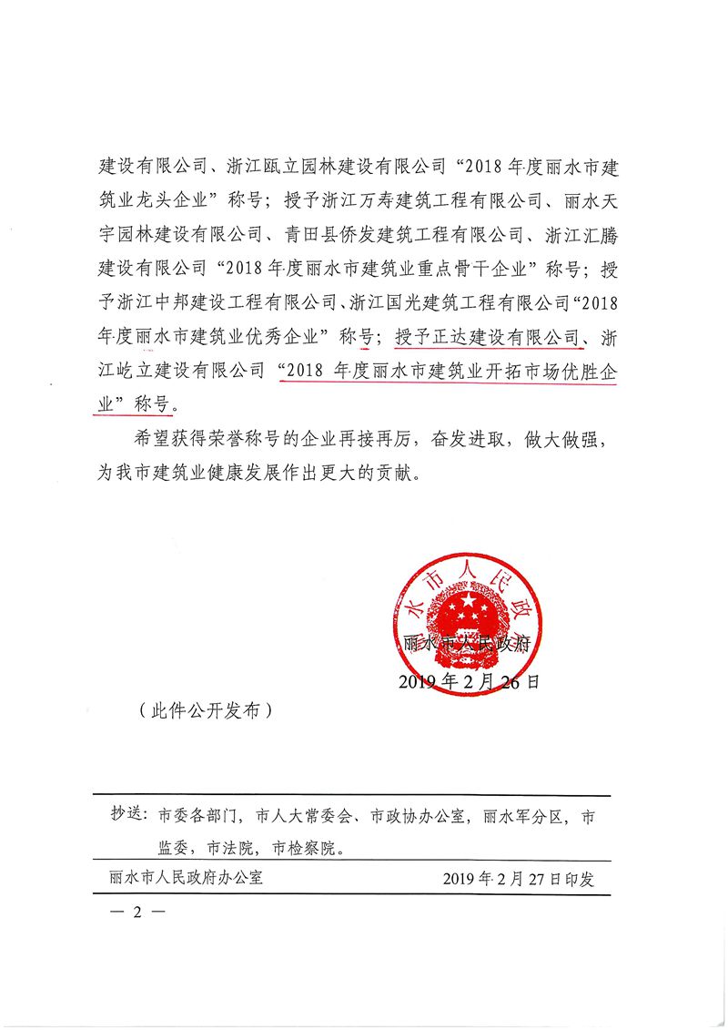 正達(dá)建設(shè)有限公司被麗水市人民政府授予“2018年度麗水市建筑業(yè)開拓市場優(yōu)勝企業(yè)”榮譽(yù)稱號