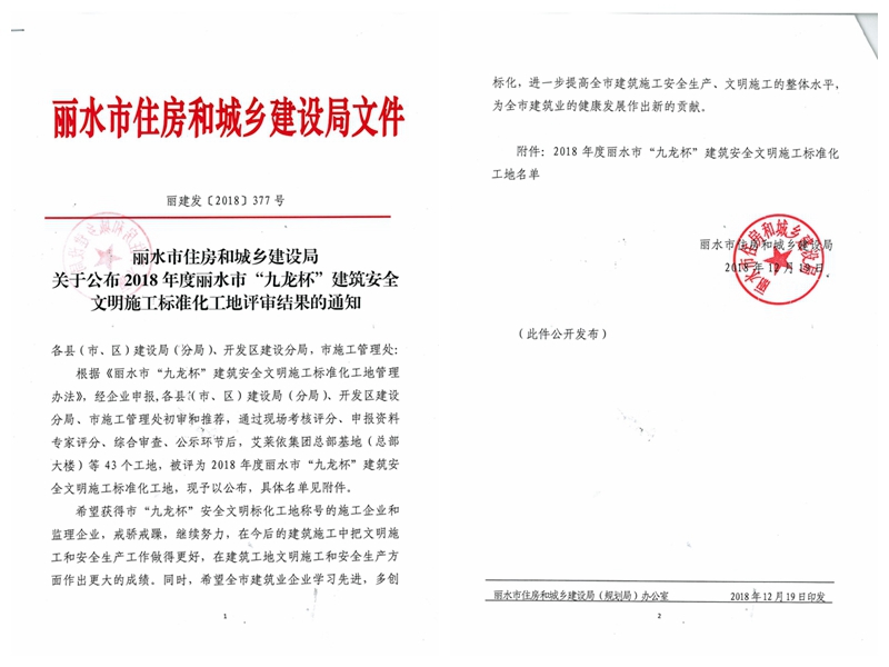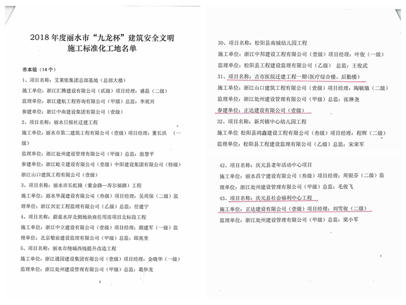正達建設(shè)有限公司參建(裝修裝飾)的松陽古市醫(yī)院遷建工程一期(醫(yī)院綜合樓、后勤樓)和施工的慶元縣社會福利中心工程,經(jīng)企業(yè)申報,縣建設(shè)局初審和推薦,通過現(xiàn)場考核評分、申報資料專家評分、綜合審查、公示環(huán)節(jié)后,被評為2018年度麗水市“九龍杯”建筑安全文明施工標準化工地。