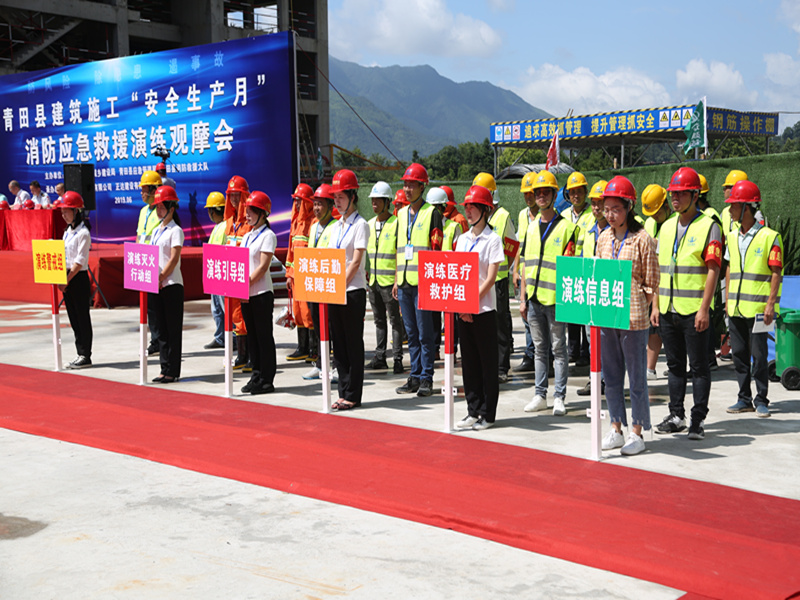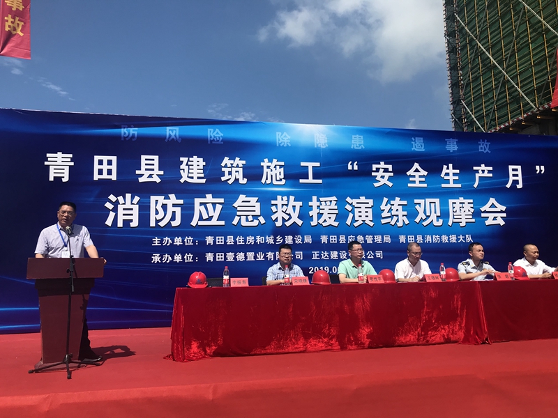 青田縣2019年建筑施工 “安全生產(chǎn)月”消防應(yīng)急救援演練觀摩會在正達建設(shè)有限公司施工現(xiàn)場召開